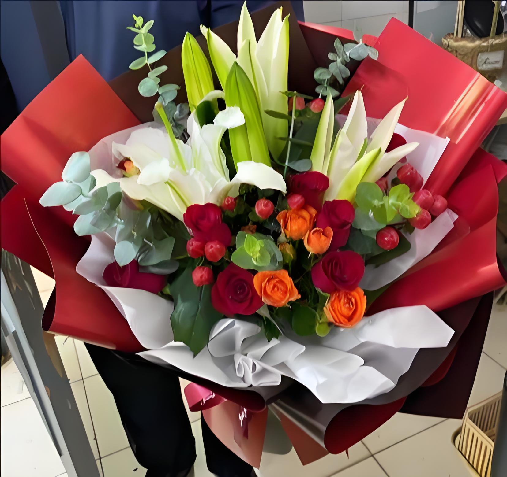 凉山州布拖县花店包11枝红玫瑰、2枝多头白百合、6枝橙色多头玫瑰、红豆、尤加利叶
